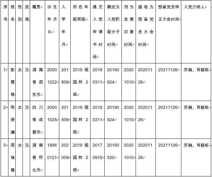 根据《中国共产党发展党员工作细则》的有关规定,在听取党小组和党员、群众意见的基础上,经支部委员会审查,园林学生党支部拟将彭雅琴等3位同志转为中共正式党员。根据发展党员工作的有关要求,现将其有关情况公示如下: