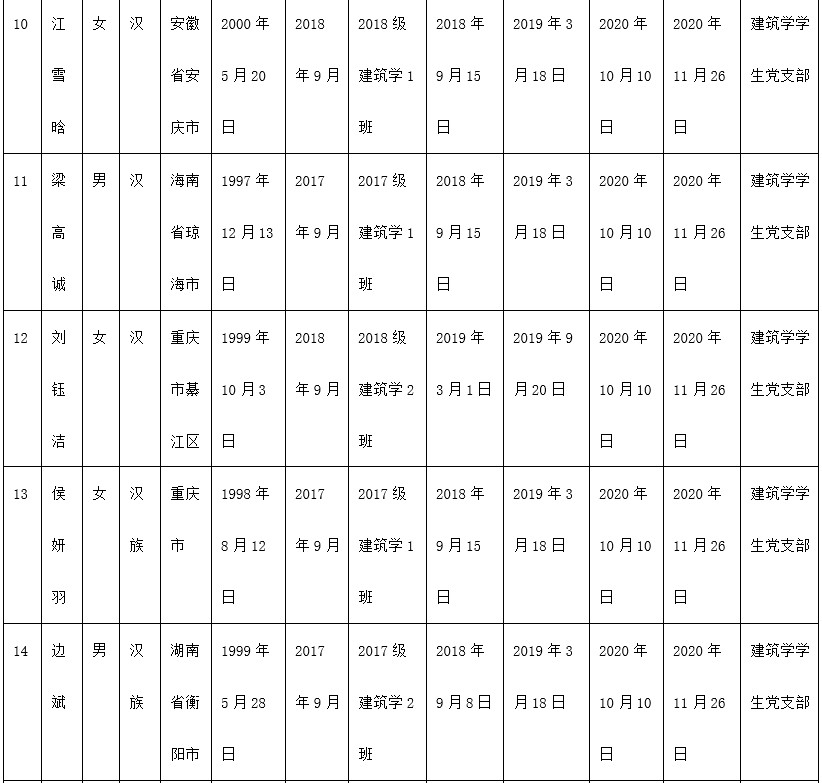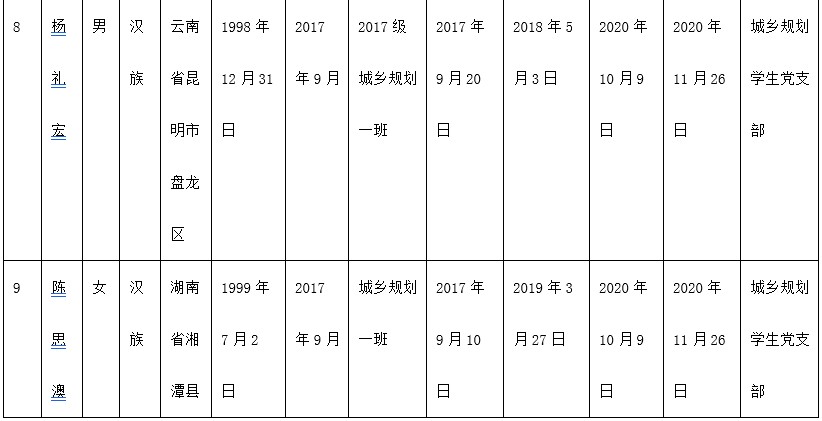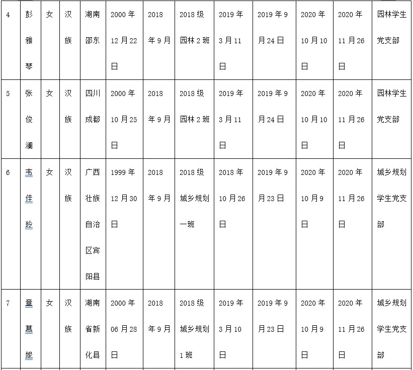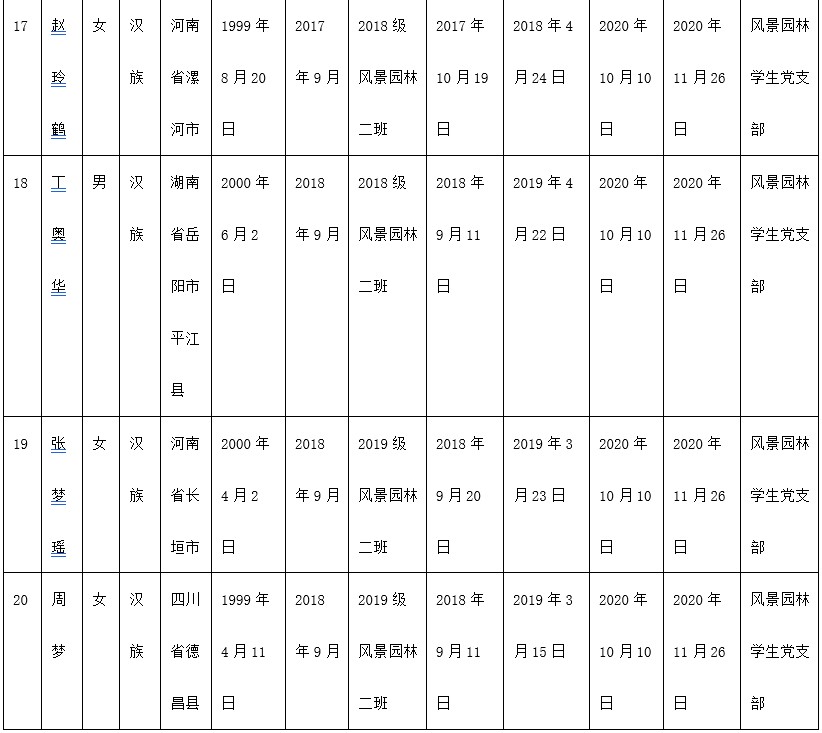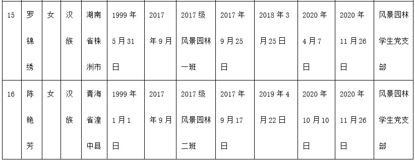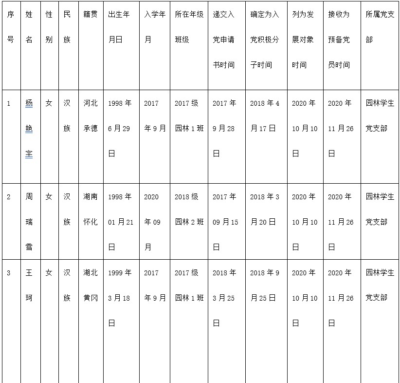 根据《中国共产党发展党员工作细则》的有关规定,现将中共中南林业科技大学风景园林学院委员会2020年下半年拟接收中共预备党员的情况公示如下: