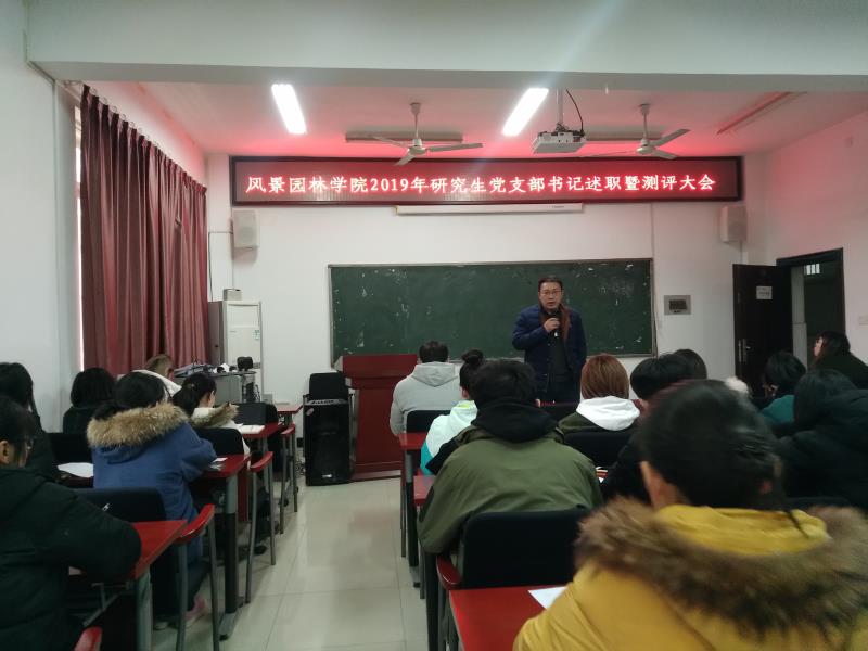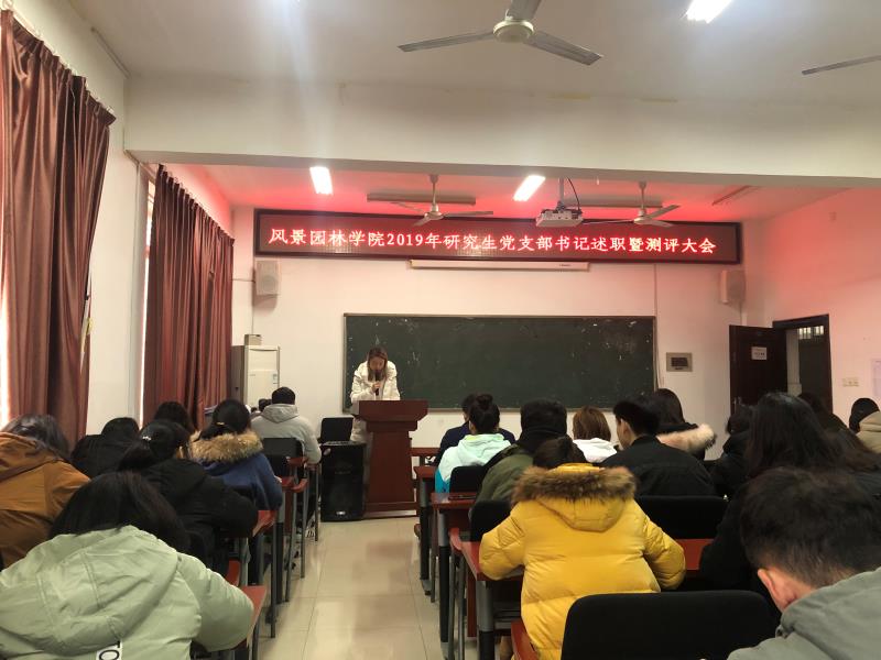 为进一步推动全面从严治党向纵深延伸,促进基层党组织建设全面进步全面过硬,按照上级党委部署要求,风景园林学院研究生党支部于2019年12月20日12:20在至美楼研究生教室召开了2019年党支部书记述职暨测评大会,本次大会的参会人员包括风景园林学院党委书记马振山老师、研究生辅导员王睿老师以及风景园林学院研究生党支部全体党员。本次会议由王睿老师主持。