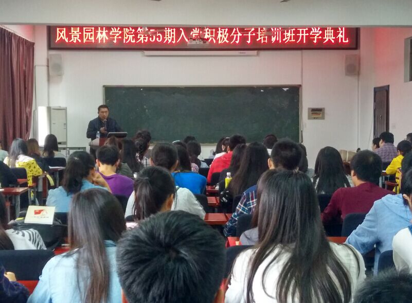 11月6日中午12:00,环艺楼二楼研究生教室座无虚席,这里进行的是风景园林学院第55期入党积极分子培训班开学典礼。出席本次开学典礼的有风景园林学院党委书记、党校校长马振山、12级辅导员蒋柯夫、13级辅导员阳玲、14级辅导员韦宝婧。主持人为风景园林学院党委副书记熊小卫。