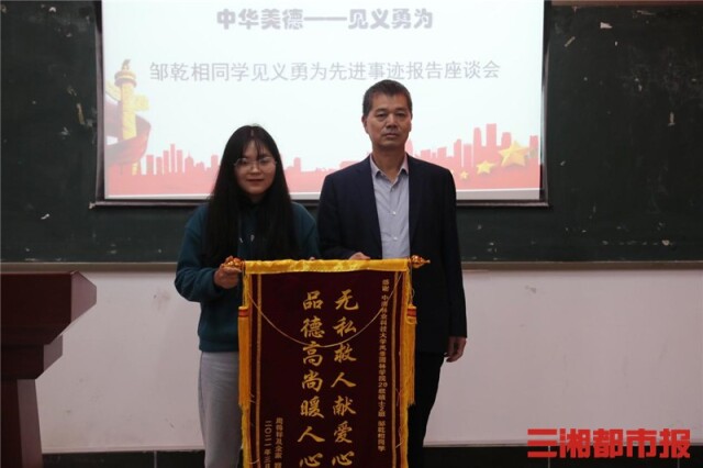 近段时间,身体康复回到工作岗位的周得祥经常想起车祸发生时可怕的场景,更感动于救人者的高尚品德。得知邹乾相就读的学校恰巧在自己工作单位附近,周得祥不顾婉拒,执意准备了锦旗和感谢信,前往中南林业科技大学向邹乾相以及培养教导她的老师们表示感谢。