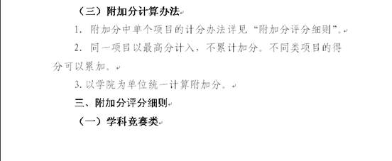(2)附加分评分细则:1. 附加分中单个项目的计分办法详见“附加分评分细则”;2. 同一项目以最高分计入,不累计加分,不同类项目的得分可以累加;3.以学院为单位统一计算附加分。(后附学校评分细则文件截图,附加分相关材料自行至相关部门认证后于9月12日上午12:00前交至学生工作办公室阳俊坤老师处)