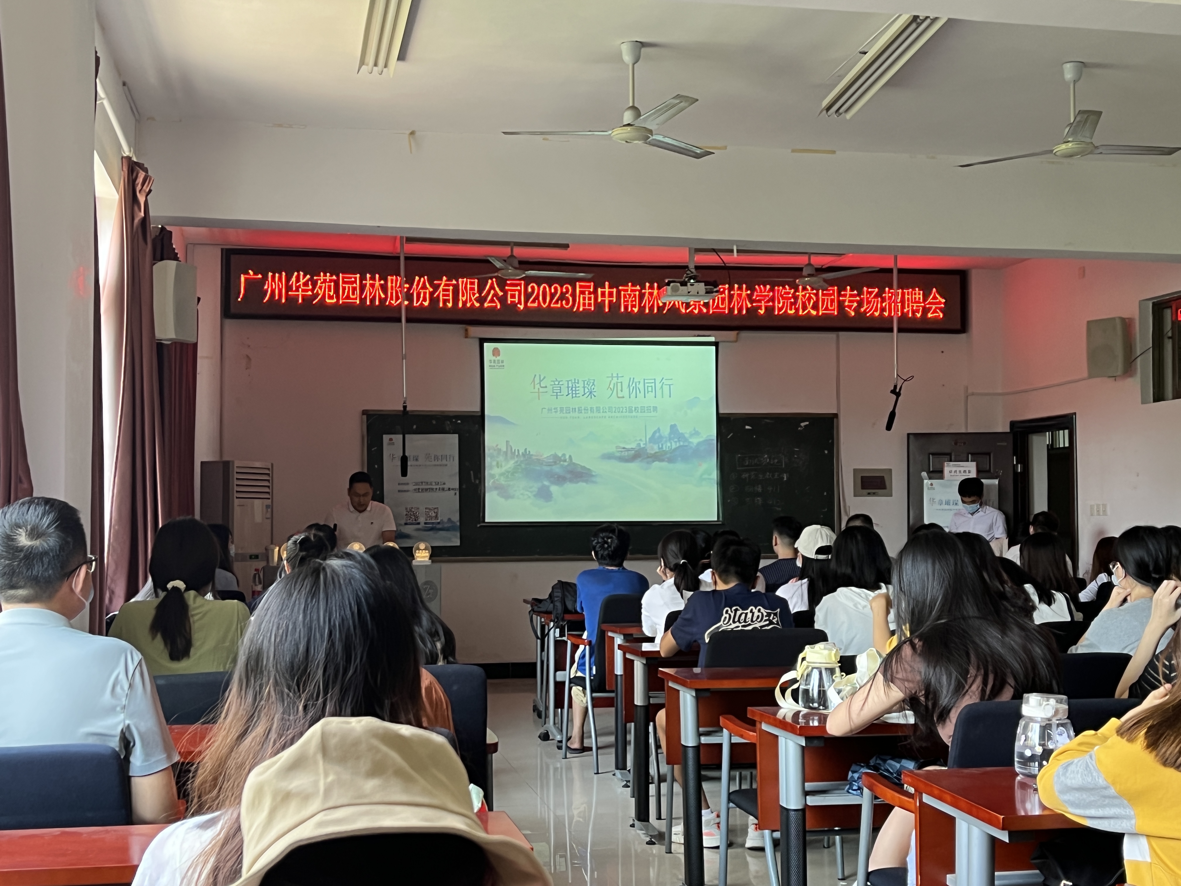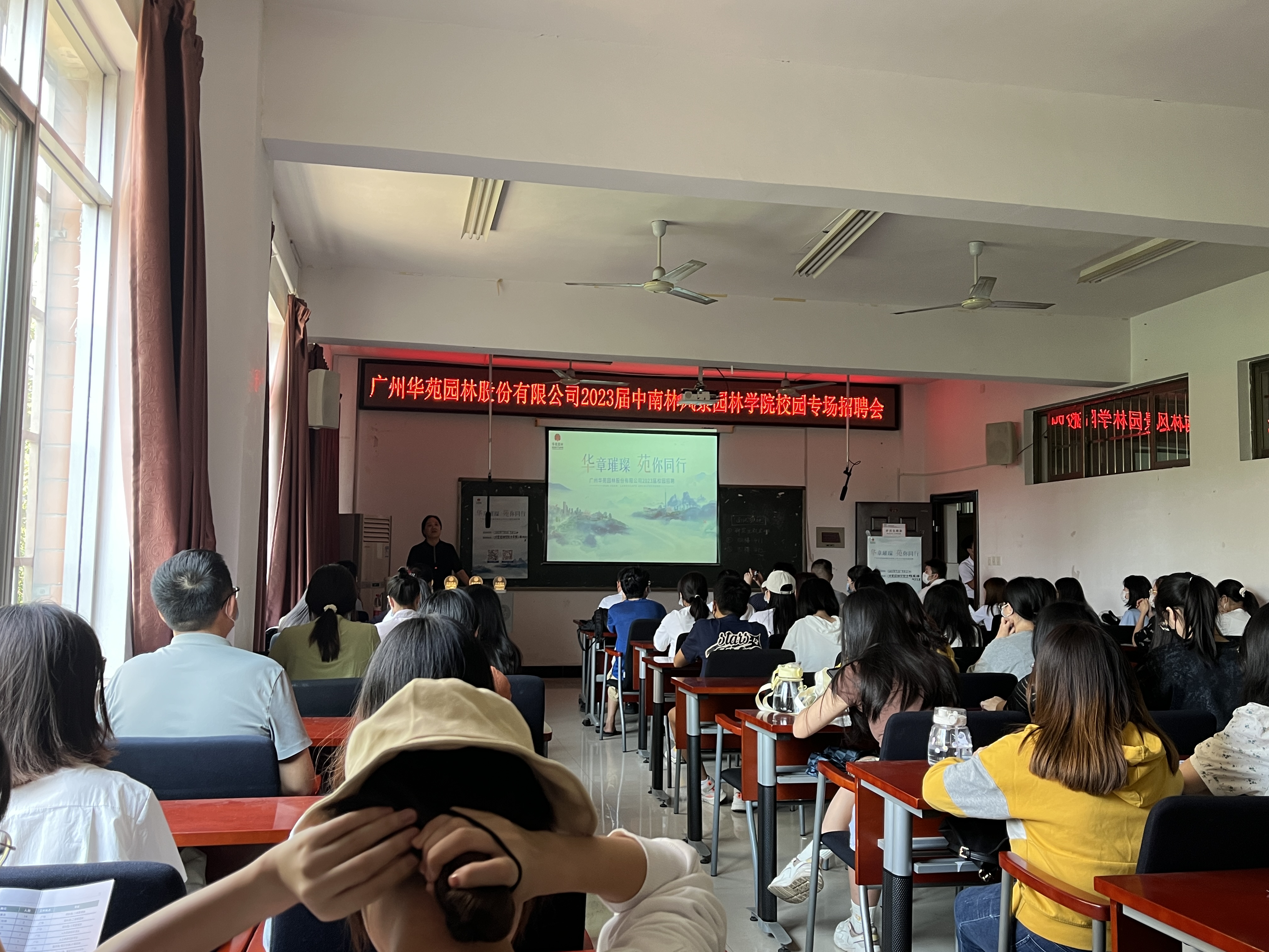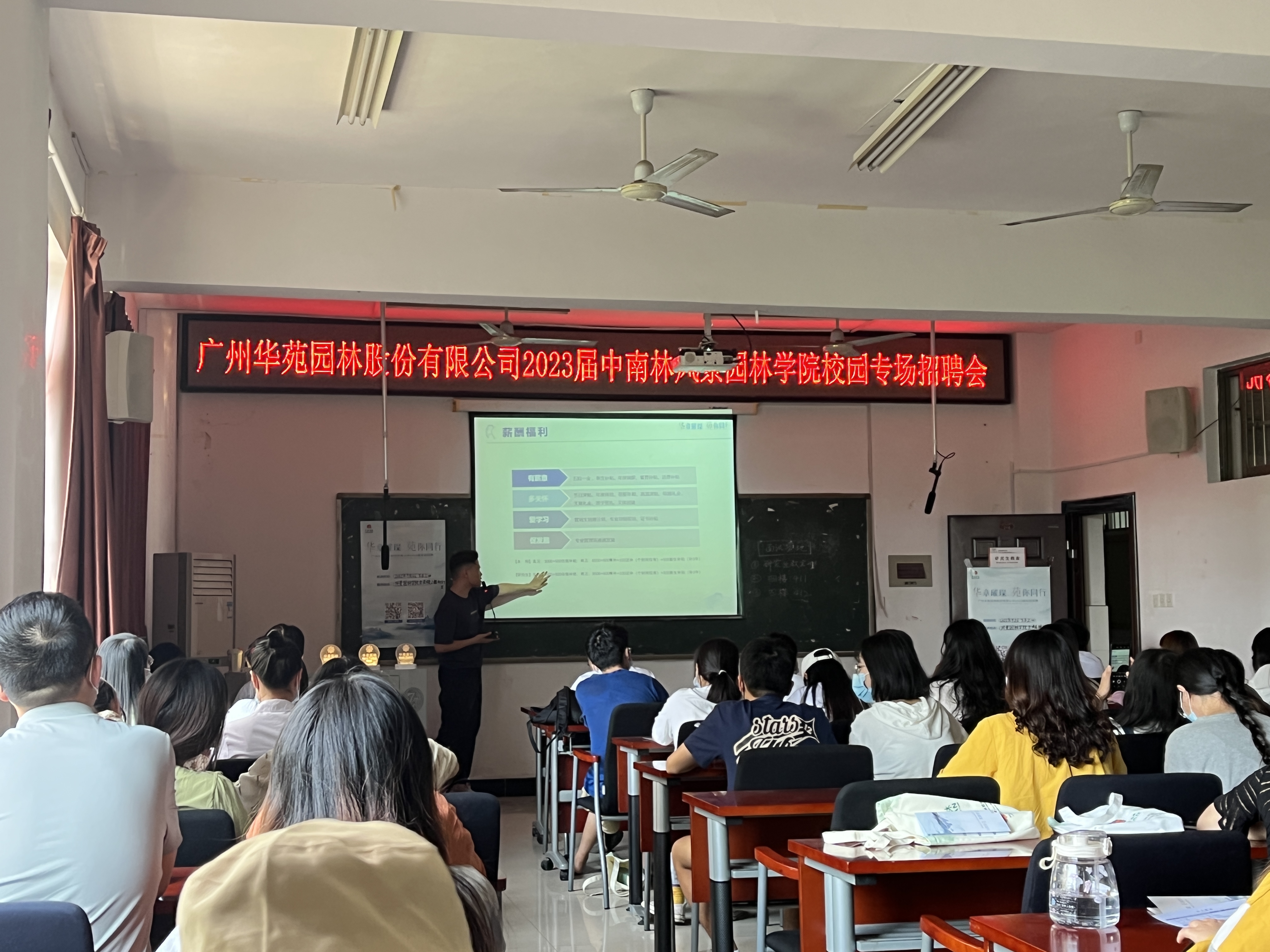 2022年9月26日下午,广州华苑园林股份有限公司在至美楼二楼教室举行了2023届中南林风景园林学院校园专场招聘会。广州华苑园林股份有限公司招聘经理刘全一行、学院党委副书记刘智娟、辅导员阳俊坤、学院毕业生参加此次会议。