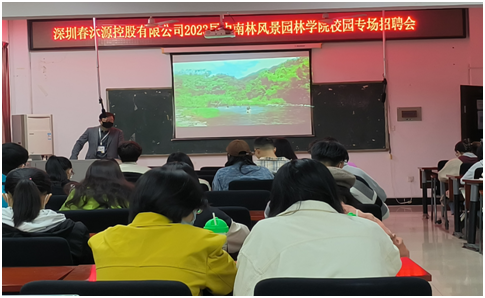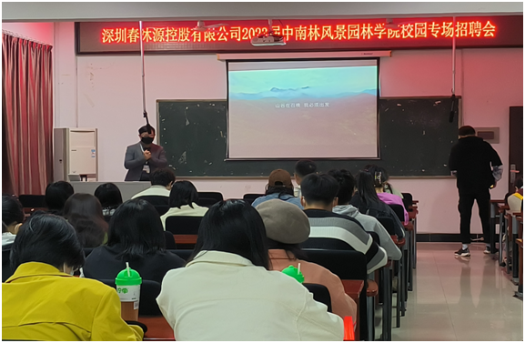2022年10月30日晚上七点,学院于至美楼二楼研究生教室举办了深圳春沐源控股有限公司2023届中南林业风景园林学院校园专场招聘会。今天来到招聘会现场的有深圳春沐源控股有限公司人力资源经理李盛以及学院毕业生。