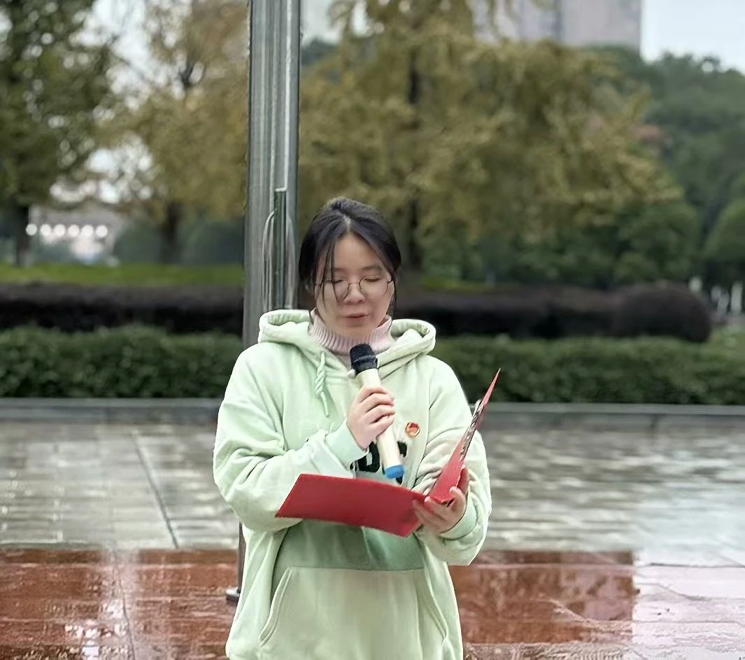 “敬礼国旗,传承经典”晨读活动,第二十五届团委常务副书记钟洁琼领读《用爱国主义凝聚起中华儿女团结奋斗的磅礴力量》。朗朗的读书声,是来自时代的回响,是跨越时空的对话。
