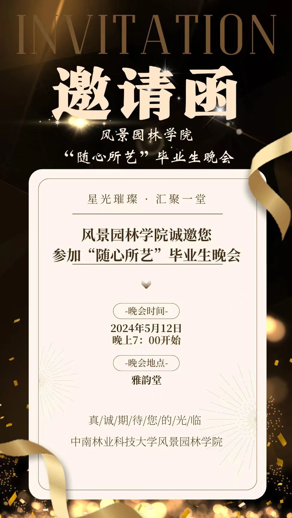 您好!我们诚挚地邀请您参加将于2024年5月12日晚七点在雅韵堂举办的“随心所艺”晚会。