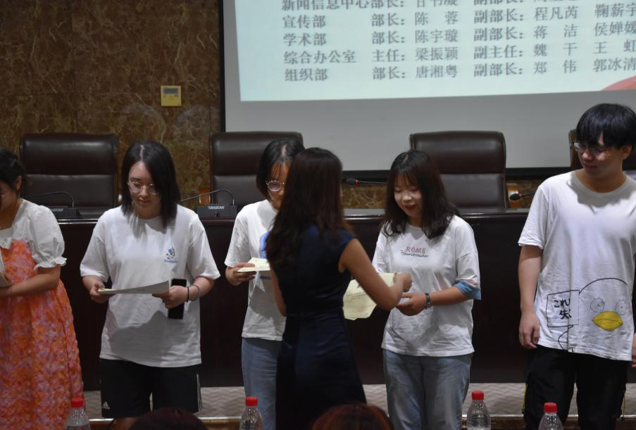 紧接着老师们和主席团成员为二十一届学生会干部和干事颁发聘书和证书,并对上一届学生干部们的辛勤工作给予了充分的肯定。拿到聘书和证书的同学们内心是十分激动与沉重的,他们自豪地拿着聘书和证书面对镜头,为这一年的工作画上了一个完美的句号。