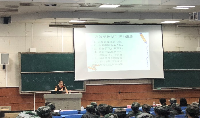第二项为学籍管理教育,由2021级新生辅导员王清扬老师担任主讲,她详细阐述了大学课堂学习、社会实践、学分管理、学业预警等多方面规定管理,提醒同学们一定要珍惜时光,勤奋学习,学有所成。