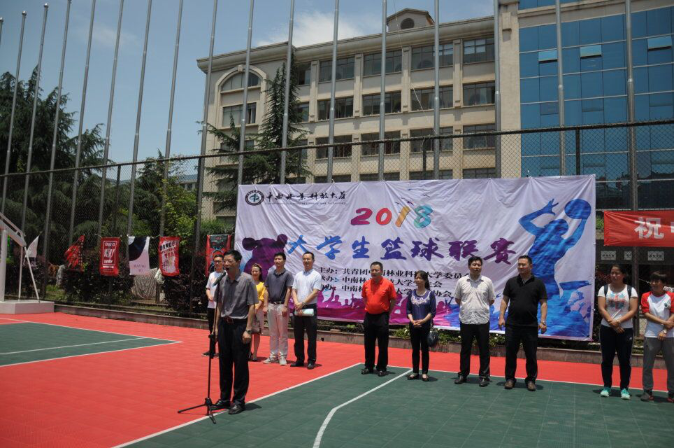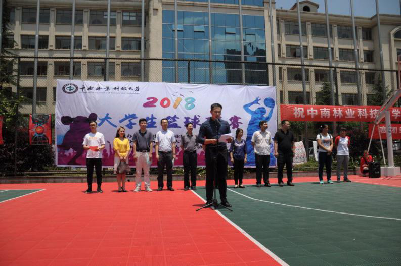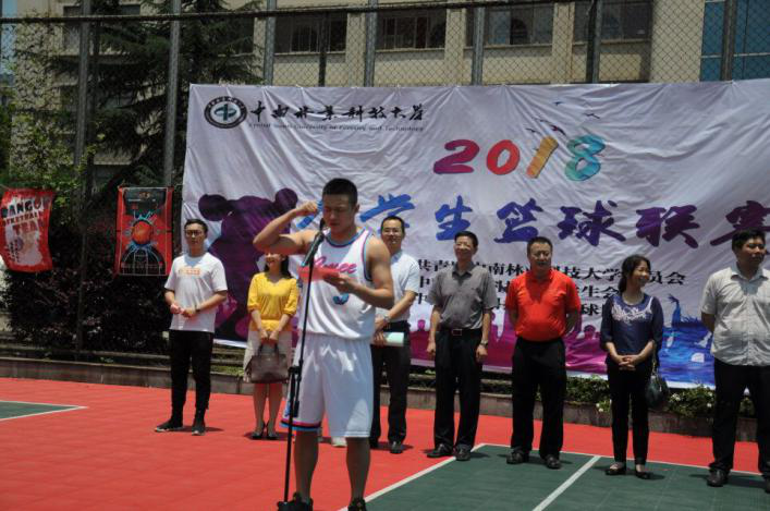 2018年5月14日中午12点整,中南林业科技大学2018年篮球联赛开幕式在学校西园篮球场隆重举行,学校副校长陈冬林、体育学院党委书记袁铁民、校团委书记李凯、学工部副部长徐见、研究生工作部副部长陈亮、校团委副书记殷丹、机电工程学院党委副书记蒋炳春、涉外学院党委副书记孟志波、校学生会主席张书瑞、各学院团委书记、学生会主要干部以及我院篮球队及学生会代表均参加了此次仪式。