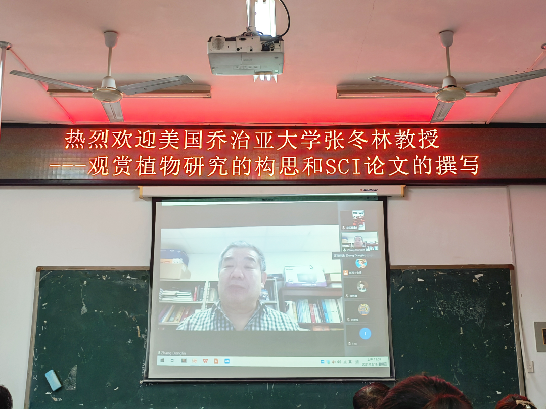 12月16日上午10:00,中南林业科技大学特聘教授,美国乔治亚大学资深教授张冬林教授为我院师生作了题为“观赏植物研究的构思和SCI论文的撰写”的线上学术讲座,线下会场为至美楼研究生教室。