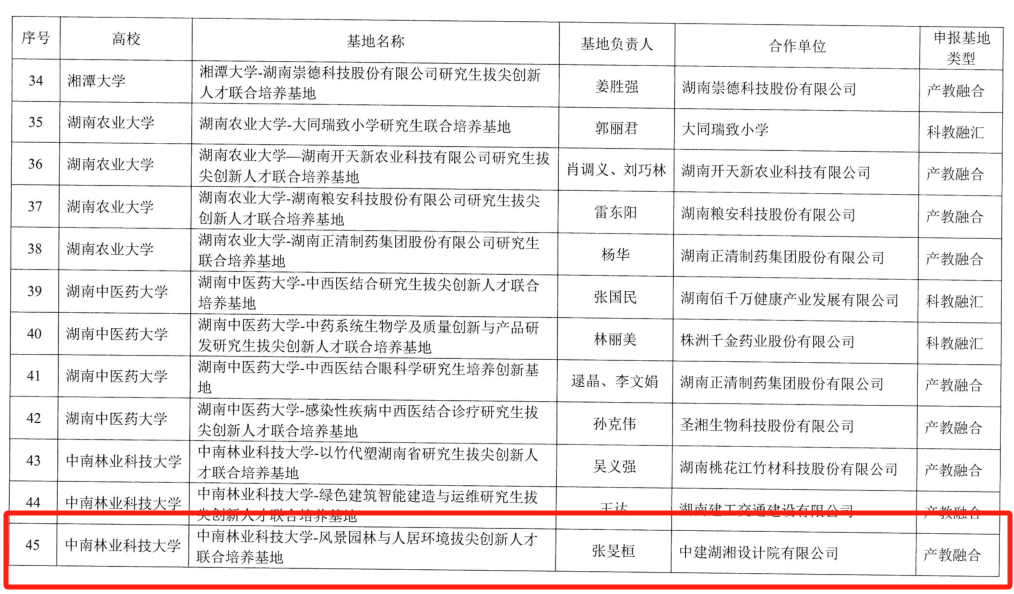近日,湖南省教育厅发布《关于公布2023年第二批湖南省研究生拔尖创新人才联合培养基地立项名单的通知》(湘教通[2023] 372号),我院申报的“中南林业科技大学-风景园林与人居环境拔尖创新人才联合培养基地”(产教融合基地)成功获批,牵头申报单位基地负责人为张旻桓。