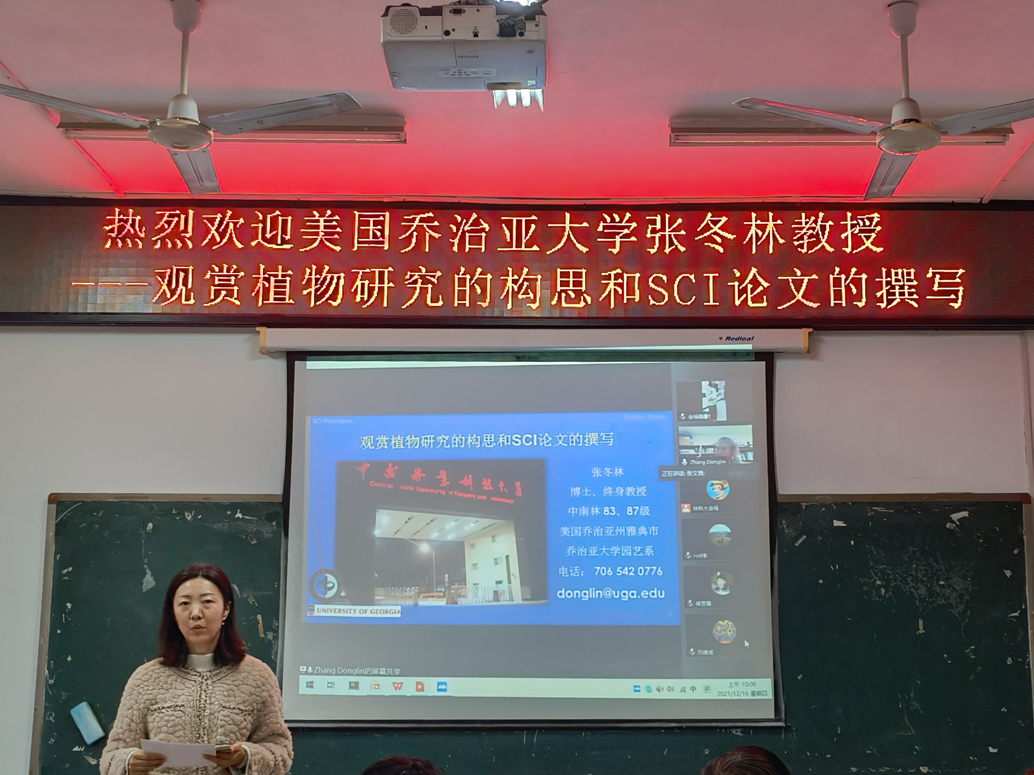 12月16日上午10:00,中南林业科技大学特聘教授,美国乔治亚大学资深教授张冬林教授为我院师生作了题为“观赏植物研究的构思和SCI论文的撰写”的线上学术讲座,线下会场为至美楼研究生教室。风景园林学院沈守云教授、林学院曹基武教授及线上线下共计280余名师生聆听讲座。讲座由张旻桓副院长主持。