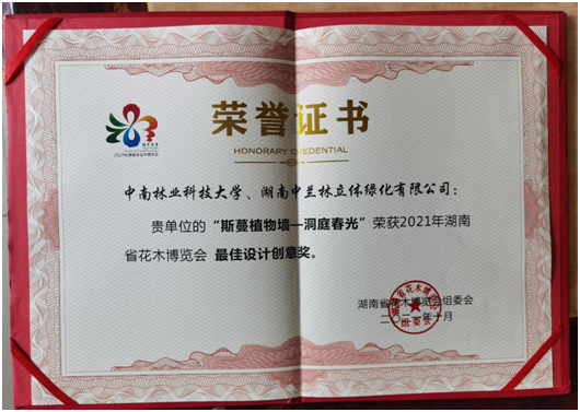 2021年湖南省花木博览会在长沙石燕湖景区开幕。我院杨柳青教授团队的科技创新成果——“无动力自动补水植物墙系统”,在博览会展出,并获最佳设计创意奖。