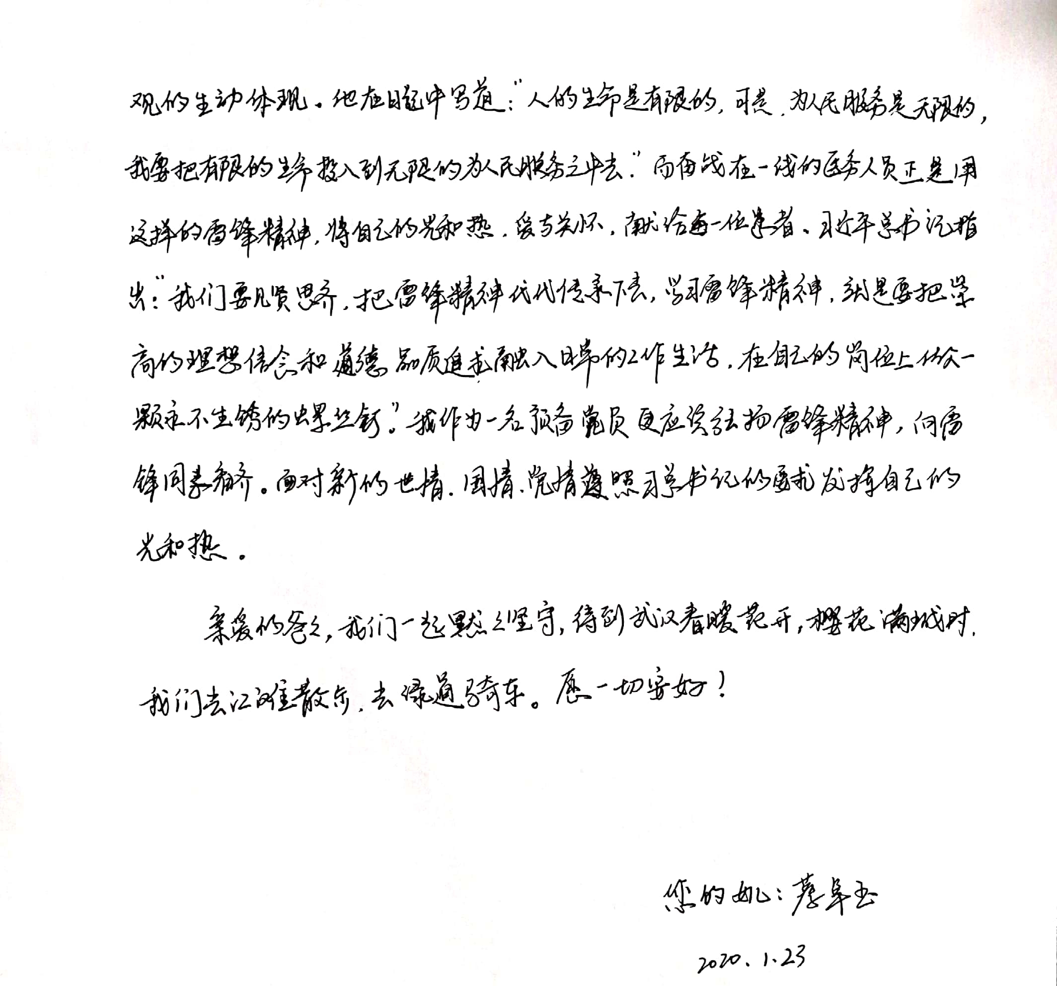 你们好!今天,是我在家闭关的第二十天。这个春节,我和大多数人一样,每天醒来的第一件事,就是查看新冠肺炎的最新进展,这是我第一次感受到自然的压迫。当这一切都与自己息息相关时,疫情地图上每一个被点亮地名都触动着我的思绪,每每看到新增的确诊人数都让我痛心,看到越来越多治愈出院的人也让我忻悦。这个全民参与的战役中,每一个关于新冠肺炎的信息都牵动着所有中国人的心。我知道,支撑我们在这场没有硝烟的战争中安稳生活的,是强大的祖国和肩负着希望、砥砺前行的医护人员。