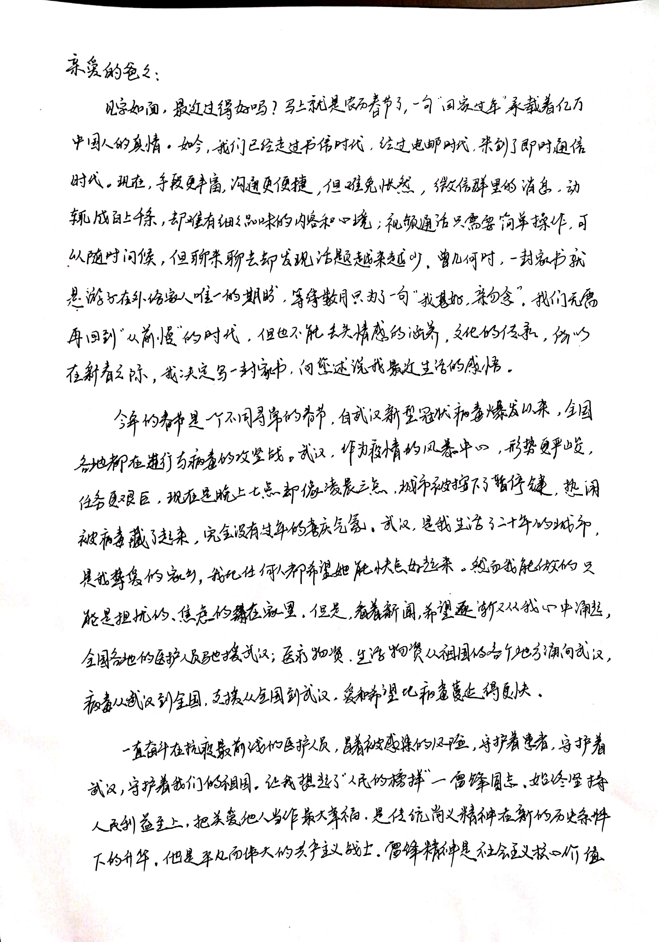 疫情最开始是发生在武汉,武汉人民的战争无疑是最艰巨的,他们最需要支持,也最需要我们的爱,来自武汉的蔡卓玉给自己的爸爸写了一封信,信中抒发了武汉人民不屈的斗志与感恩的心。