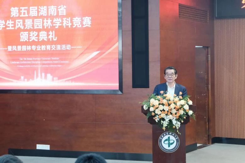2025年3月22日,由湖南省教育厅主办、中南林业科技大学风景园林学院承办的第五届湖南省大学生风景园林学科竞赛颁奖典礼暨风景园林学科与专业教育交流活动,在中南林业科技大学西园博文楼立德厅举行。中南林业科技大学党委副书记王忠伟、湖南省风景园林学会理事长沈守云等领导专家齐聚一堂,来自全省25所高校的师生代表近300人参会。开幕颁奖和作品点评交流活动分别由风景园林学院院长文亚峰和副院长廖秋林主持。