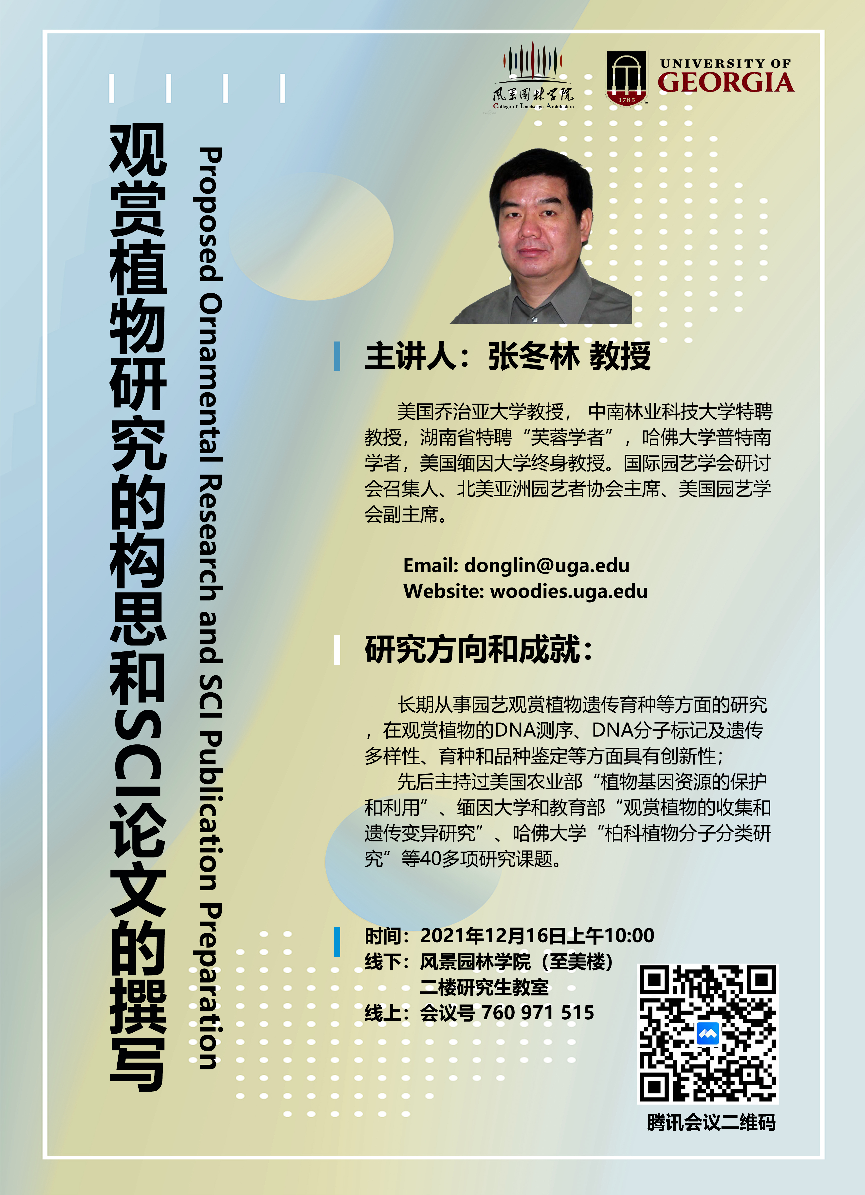 主讲人:张冬林教授,美国乔治亚大学教授,中南林业科技大学特聘教授,湖南省特聘“芙蓉学者”,哈佛大学普特南学者,美国缅因大学终身教授。国际园艺学会研讨会召集人、北美亚洲园艺者协会主席、美国园艺学会副主席。